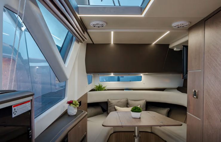 Sotto coperta, Galeon punta a un ambiente che non imita un cruiser classico, ma ne prende l’essenziale: overnight credibile, bagno separato e aree trasformabili. La sfida è offrire un comfort “da weekend” senza appesantire troppo la barca con mobili eccessivi. Qui i materiali contano per due ragioni: estetica (finiture, tattilità, luci) e ingegneria (peso, distribuzione, resistenza all’umidità). Un buon progetto usa pannellature e moduli con un rapporto rigidezza/peso adeguato, evitando che la ricerca del “look” si traduca in masse inutili in alto o troppo a prua.