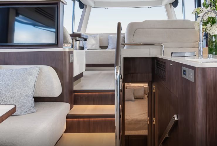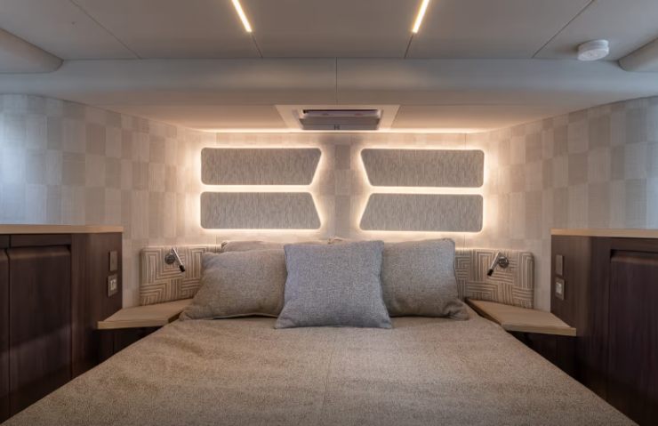 Il layout privilegia la continuità tra salone e aree esterne. Le soluzioni trasformabili (sedute reversibili, aperture ampie, possibile “dialogo” con i balconi) hanno un obiettivo preciso: far percepire una barca più grande. Dal punto di vista ergonomico, la qualità si misura su dettagli: altezze utili, passaggi, angoli di seduta, accesso a frigoriferi e stivaggi, e la capacità di vivere in quattro persone per settimane senza che la barca “stringa”.