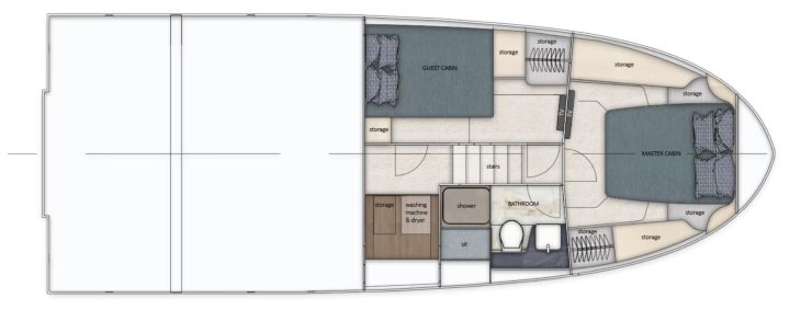 Su un 14 metri, la tentazione di inserire una terza cabina è forte, soprattutto per il charter. Galeon sceglie una via più coerente con l’Explorer: due cabine e due bagni, con spazi più generosi e maggiore vivibilità. Per l’armatore privato, significa comfort quotidiano; per il charter di fascia alta, significa qualità percepita superiore, perché gli ospiti non “pagano” la notte con compromessi eccessivi.