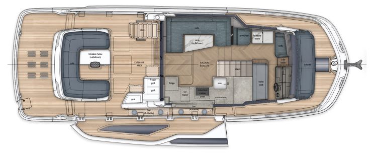 I balconi abbattibili non vanno letti solo come elemento scenografico. Dal punto di vista funzionale, aumentano la sezione fruibile in rada e ridisegnano la relazione con l’acqua: sedute che si affacciano direttamente sul mare, aree lounge che “sorvolano” lo specchio acqueo, percorsi di bordo più fluidi tra pozzetto e living. In navigazione restano ovviamente chiusi, ma la barca è pensata per valorizzare due condizioni tipiche della crociera moderna: rallentare, sostare, vivere all’ancora.