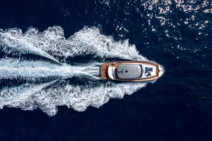 La scelta di una V di prua molto pronunciata (Boatmag riporta valori fino a ~60° a prua con transizione a ~21° a mezzanave e ~15° a poppa) riduce l’impatto sulle onde e innalza il comfort acustico e vibrazionale, mentre le ampie sezioni poppiere garantiscono portanza in assetto di planata, a beneficio di consumi e risposta allo sterzo. L’opera viva integra spray-rails studiati per contenere l’umidità sul ponte e mantenere la prua più asciutta possibile in mare formato.