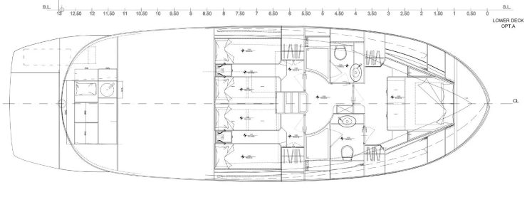 - Layout sottocoperta (modulare): 2 o 3 cabine + 2 bagni con docce separate; possibilità cabina marinaio a poppa con accesso dal pozzetto.
