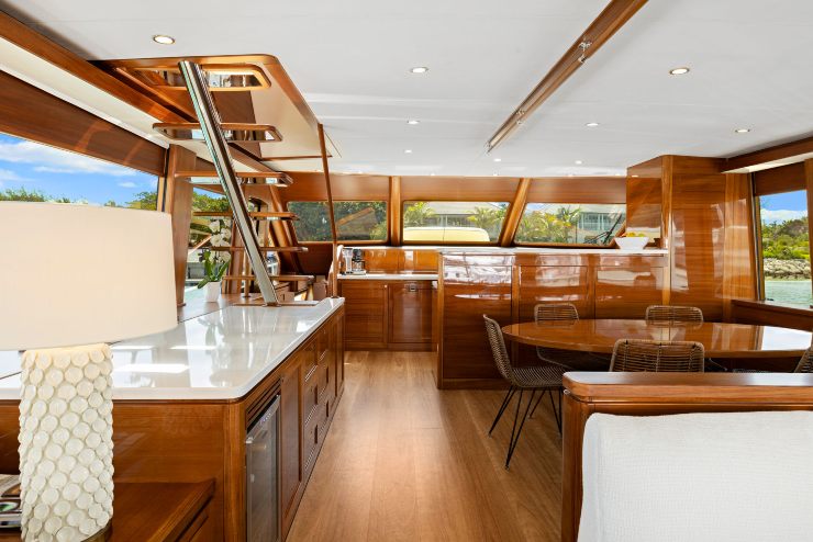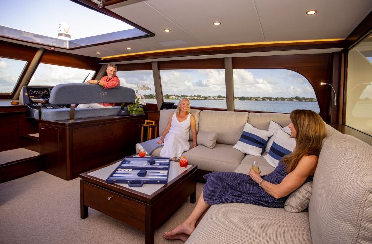 La GB85 interpreta la tradizione del marchio con una grammatica più moderna: finestrature ampie, salone luminoso e un rapporto diretto tra pozzetto e living. Alcune recensioni sottolineano la percezione di “spazio arioso” e la vivibilità in crociera, con soluzioni come aperture vetrate e continuità tra aree sociali interne ed esterne.