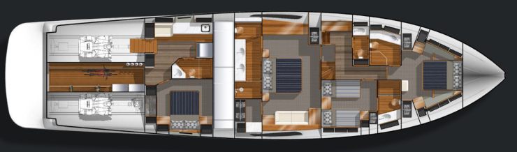 In un 85 piedi destinato a lunghe percorrenze, la sala macchine deve essere pensata come un ambiente operativo, non come un vano tecnico. Qui la progettazione tipica della categoria punta su: passaggi perimetrali, accessi ai filtri, visibilità delle pompe, e lay-out che permetta interventi ordinari senza contorsioni. Le recensioni evidenziano come la barca sia concepita per la crociera reale, con spazi tecnici che dialogano con l’uso armatoriale e – se richiesto – con l’operatività dell’equipaggio.
