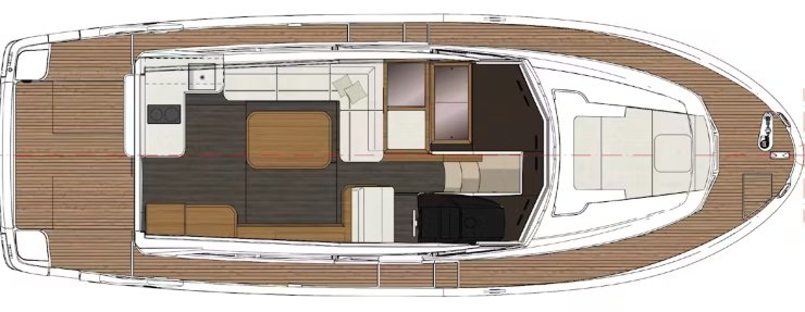La cucina è impostata per essere realmente usata: piani di lavoro sensati, stivaggi, e la possibilità di gestire la vita a bordo come in un appartamento compatto. La dinette, grazie alla luminosità e alle superfici vetrate, diventa un ambiente “tutto il giorno”, non una zona di passaggio. Le circolazioni sono pulite: si può muovere un equipaggio familiare senza urti continui, e questo nella crociera fa la differenza più di dieci cavalli in più.