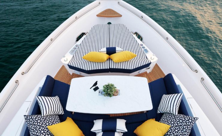- Prua: area lounge con divano a U e tavolo da pranzo, integrata a grandi cuscinerie prendisole, ideale per la sosta in rada.