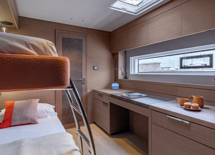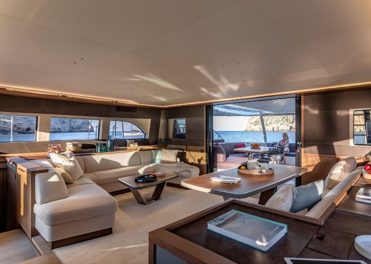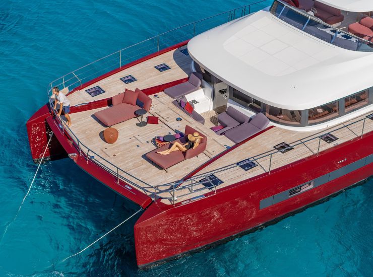 Sul fronte sicurezza, la categoria CE arriva fino alla classe A, e l’impiantistica include pompe di sentina manuali ed elettriche, allarmi, sistemi di monitoraggio e una compartimentazione tecnica coerente con il posizionamento. L’insonorizzazione dei vani motore e la ventilazione dedicata contribuiscono in modo diretto al comfort, così come la riduzione del rollio tipica della piattaforma multiscafica. In mare formato il catamarano non elimina del tutto beccheggio e movimenti verticali, ma restituisce una sensazione generale di controllo e compostezza molto apprezzata da famiglie, ospiti e charterer.