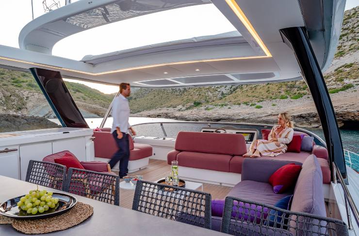 La sensazione dominante, osservando gli interni e leggendo la barca attraverso le fotografie ufficiali, è quella di un progetto che lavora sulla continuità visiva: grandi vetrate, visuali diagonali molto aperte, arredi bassi dove serve, percorsi intuitivi e un rapporto stretto fra lounge, dining e aree esterne. In termini ergonomici, significa muoversi meglio, vivere più comodamente e percepire meno affollamento anche con diversi ospiti a bordo.