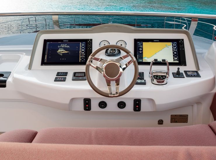L’apparato di governo impiega una trasmissione idraulica con un attuatore per timone, soluzione che contribuisce alla precisione in manovra e alla progressività della risposta. La postazione di comando sul flybridge è stata studiata con attenzione funzionale, così come la gestione dei controlli motore elettrici. Nelle prove in mare, diversi osservatori hanno sottolineato come la barca si riveli più agile del previsto nelle virate e nelle manovre di porto, considerato l’ingombro complessivo dell’unità.