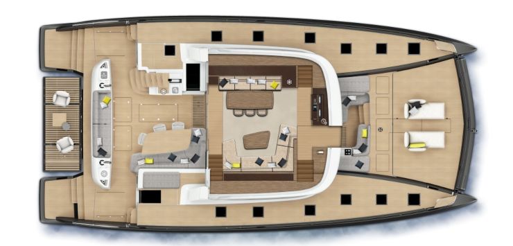 Il cuore del progetto è però il layout. Il salone è pensato come spazio continuo, con ampie aperture verso il pozzetto e una fluidità che ricorda più un attico panoramico che una cabina di coperta tradizionale. Le configurazioni disponibili consentono diverse interpretazioni, da versioni owner-oriented a layout più orientati all’ospitalità numerosa o al charter di alta gamma. Il numero di cabine può variare sensibilmente, così come la distribuzione delle aree di servizio e delle zone equipaggio.