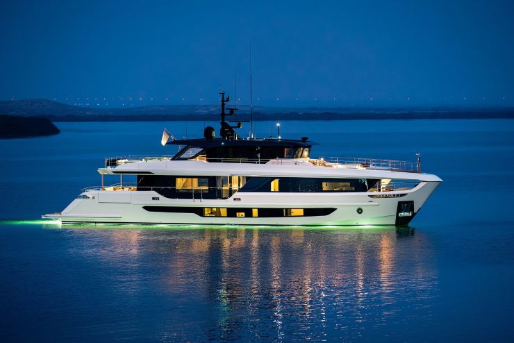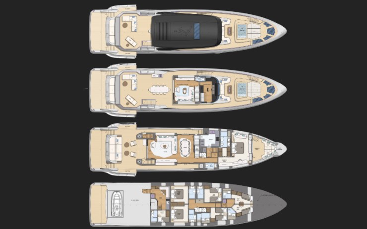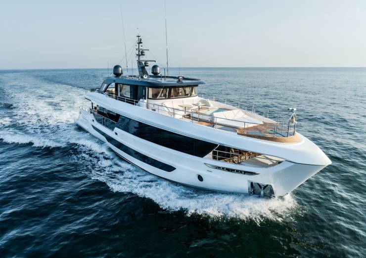 - Custom Line 106’ — 32,8 m, 210–230 GT, 26 kn max, 23 kn di crociera, autonomia ~1.050 nm @ 12 kn. Più veloce e rifinito secondo tradizione Ferretti Group, ma con impostazione più sportiva e meno focalizzata sulla privacy a prua.