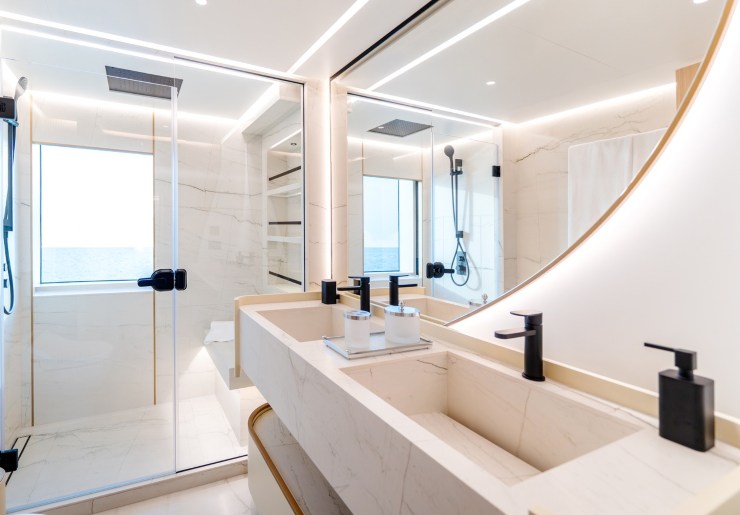 La cabina armatoriale è il cuore dell’esperienza: affaccio a 270°, patio doors e accesso diretto alla prua-terrazza, bagno a doppio accesso e volumi guardaroba generosi. Sul lower deck, quattro cabine ospiti en-suite sono configurabili in mix VIP double e twin convertibili. I materiali enfatizzano tattilità e assorbimento acustico nei punti sensibili (sotto i passaggi, contro le paratie tecniche), con illuminotecnica a scenari che valorizzano texture e profondità.