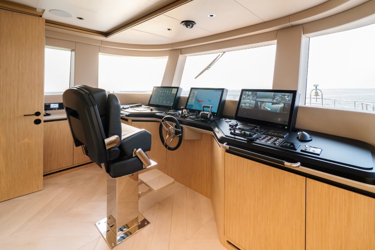 La wheelhouse rialzata adotta un’impostazione glass bridge con schermi multipli ad alta definizione per conning, radar/ARPA, ECDIS/cartografia, gestione power & hotel loads e integrazione alarm & monitoring. La visibilità a 270°, cifra stilistica del 100 piedi, resta un plus per conduzione costiera e manovra in rada.