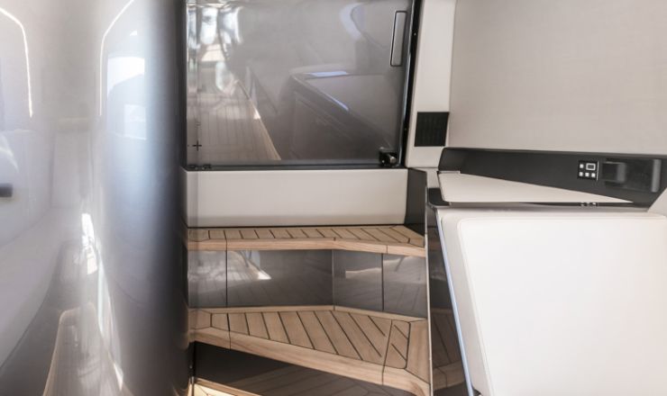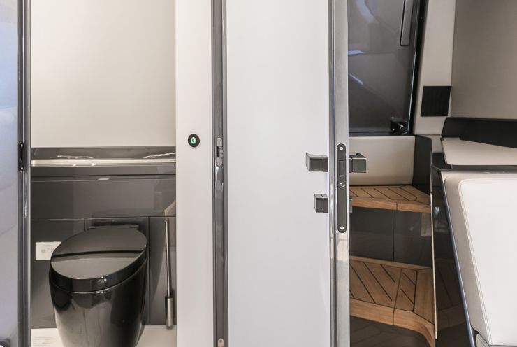Completano gli interni un locale bagno con WC marino, lavandino e box doccia indipendente (a seconda delle versioni), illuminazione LED diffuse e luci di cortesia, oltre a una scelta accurata di rivestimenti: pannellature soft-touch, inserti in essenze naturali o laccature opache e dettagli in carbonio o metallo satinato. Le foto di dettaglio mettono in evidenza la qualità delle cuciture delle cuscinerie, i profili anodizzati e la pulizia degli allineamenti, elementi che confermano l’impronta premium del cantiere.