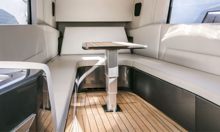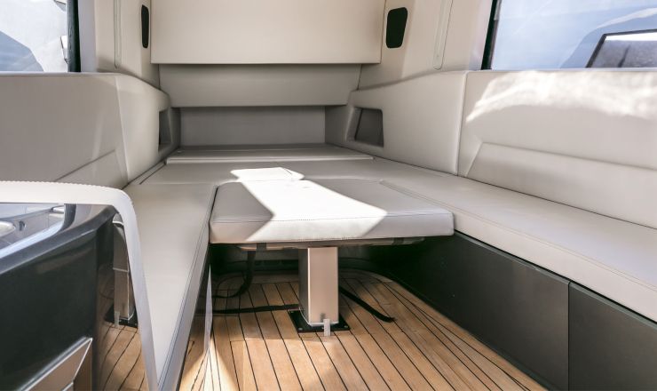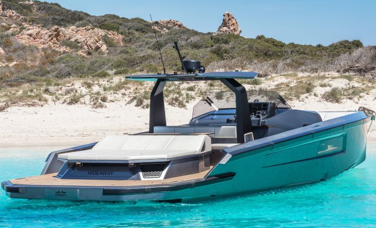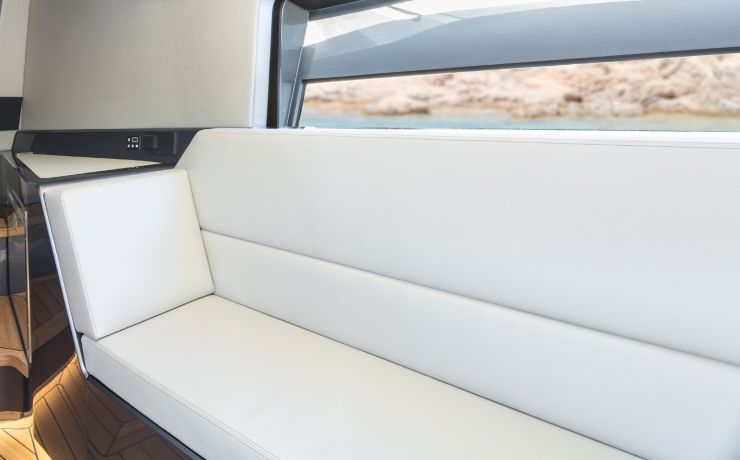 Il T-top composito, leggero ma strutturale, copre generosamente l’area di guida e parte del pozzetto, con integrazione di faretti LED IP66 per l’illuminazione notturna. Tendalini di prua e di poppa su pali in carbonio, spesso visibili nelle immagini ufficiali, permettono di estendere l’ombra su quasi tutta la superficie di coperta, rendendo la barca vivibile anche nelle ore più calde. La combinazione di superfici scure, inserti in carbonio, teak sintetico o naturale e acciaio satinato contribuisce a un’estetica fortemente contemporanea.