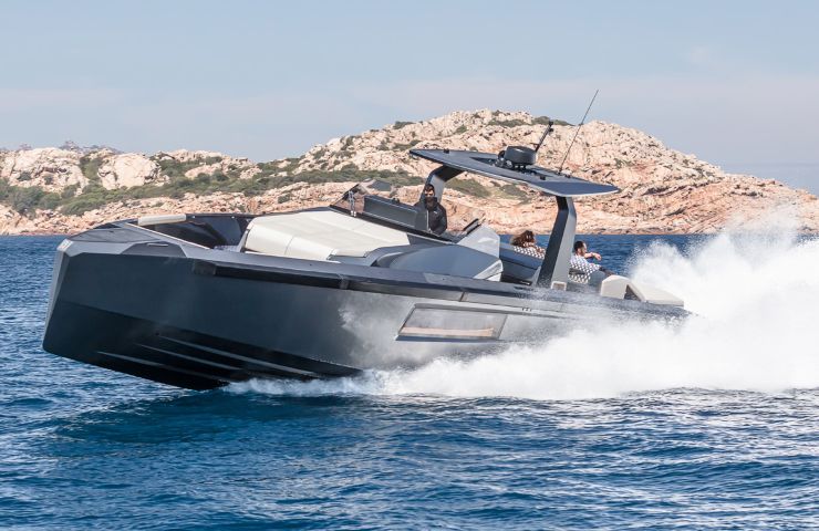 Dal punto di vista idrodinamico, la carena è planante a V profonda con deadrise marcato a poppa e pattini longitudinali che contribuiscono a generare portanza e a mantenere asciutta la navigazione. L’assetto neutro, supportato da flap/interceptor, consente di passare con sicurezza da un’andatura dislocante a 8–10 nodi fino alle velocità massime prossime ai 45–50 nodi, mantenendo controllo e precisione di governo.