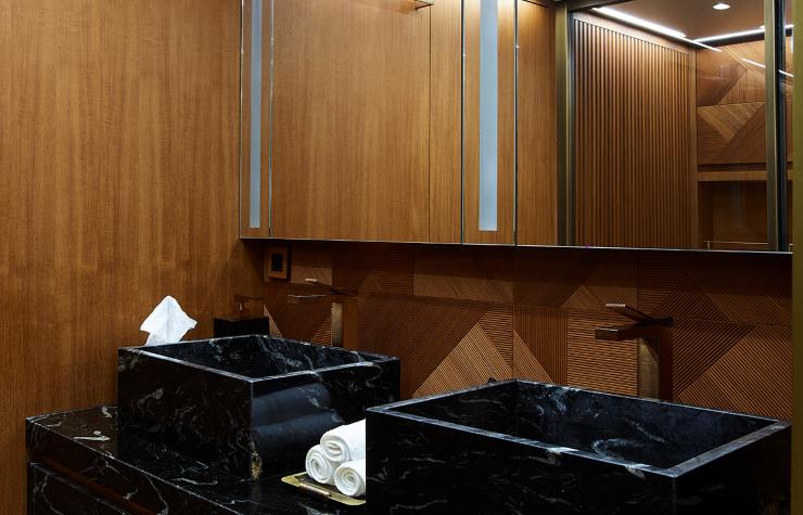 Internamente, la filosofia costruttiva combina essenze pregiate, pelli naturali trattate, superfici compositive in microcemento marino, acciai spazzolati e dettagli artigianali che enfatizzano la raffinatezza del design. Ogni elemento è studiato con precisione millimetrica: dagli incastri strutturali alle cornici dei pannelli, fino ai sistemi di fissaggio dei mobili.