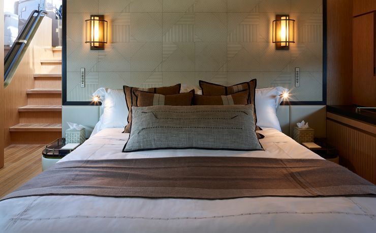 Sottocoperta troviamo una configurazione estremamente flessibile, con la possibilità di customizzare cabine, area lounge, suite armatoriale, cucina e crew area. Gli interni seguono una filosofia “soft industrial”, con grandi superfici lineari, tagli di luce naturali, pannellature texturizzate e arredi integrati nella struttura.