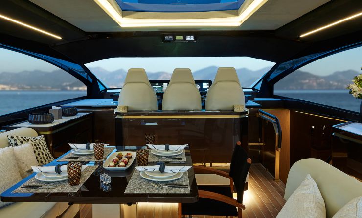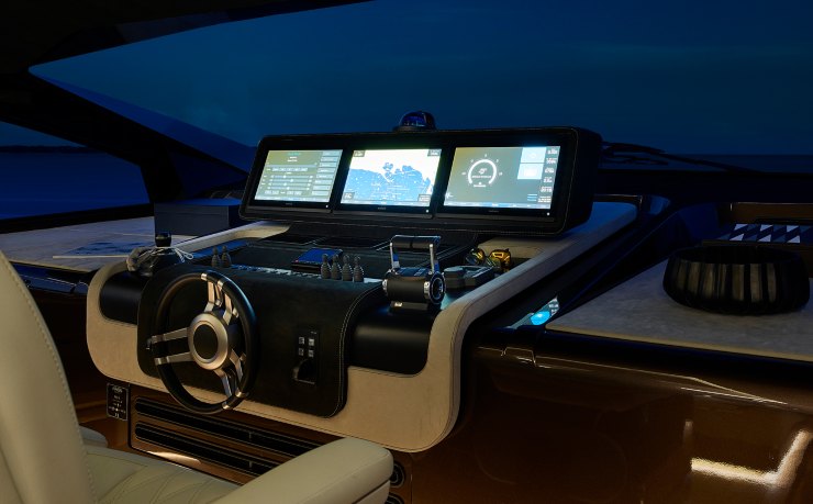 Lo yacht è dotato di un sistema elettronico di ultima generazione, con plancia digitale full-touch, comandi joystick integrati, stabilizzatori giroscopici e un pacchetto di sensori avanzati per monitorare consumi, bilanciamento e performance del motore.