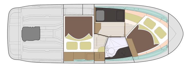 La scelta del monomotore abbinato a coppie coniche duo-prop non è “risparmio”: è progettazione per rendimenti globali su un 31’ familiare. Il fast canopy (uno dei sistemi più rapidi del mercato) estende la stagione, riduce condensa e stress sugli arredi; gli interceptor attivi aumentano finestra d’impiego e comfort in mare corto, migliorando consumi e stabilità direzionale. La disponibilità del Joystick Docking su single DPI è un’ulteriore democratizzazione delle manovre a bordo piccolo.