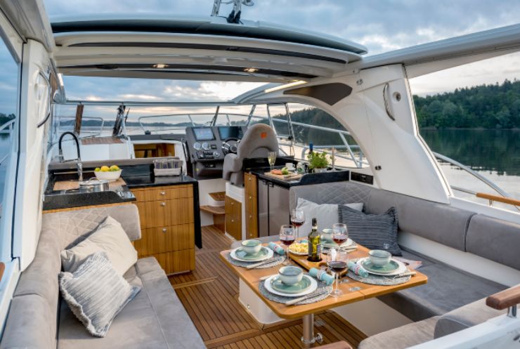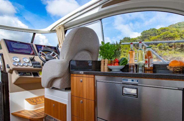 Il tratto estetico è pulito, con fiancate tese e superfici vetrate che alleggeriscono l’hardtop. La firma più riconoscibile è il cockpit a tutta larghezza con divani perimetrali, tavolo centrale abbattibile e grande cucina a U affacciata alla vita di bordo: piano lavoro estensibile, frigorifero di dimensioni domestiche, fuochi e sink sono organizzati con logica “galley-up” per servire pranzo e cena senza isolare lo chef dal gruppo. Sottocoperta, due cabine (armatoriale a prua e full-beam a poppa) e un bagno con box doccia separato massimizzano privacy e comfort.