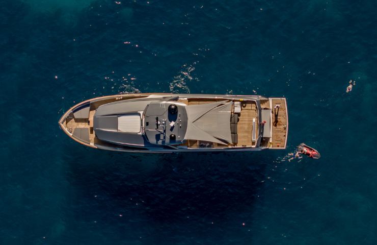 Il linguaggio formale di Can Yalman si riconosce nelle superfici tese, nei montanti sottili e nella grande vetrata longitudinale che alimenta la luce naturale sul ponte principale. L’overhang del fly proietta ampiamente a poppa, generando un’area d’ombra significativa sul pozzetto e un terrace deck sopraelevato di raro respiro per la taglia. A prua, una lounge protetta ospita prendisole e sedute, ideale in rada. La plancetta di poppa (anche up/down opzionale) è dimensionata per tender generosi, con capacità di carico adeguata alle esigenze charter.