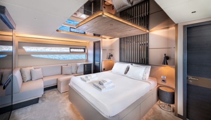 All’interno, il main deck sviluppa un salon a piena larghezza visiva con zona living e pranzo, mentre la cucina può essere open o separata. Sottocoperta sono previste 4 o 5 cabine per 8–10 ospiti, inclusa una armatoriale full-beam, oltre a 2 cabine equipaggio (fino a 4 posti). Lo studio degli spazi privilegia passavanti sicuri, sezioni verticali confortevoli e un layout scalabile in funzione del profilo d’uso (privato vs charter).