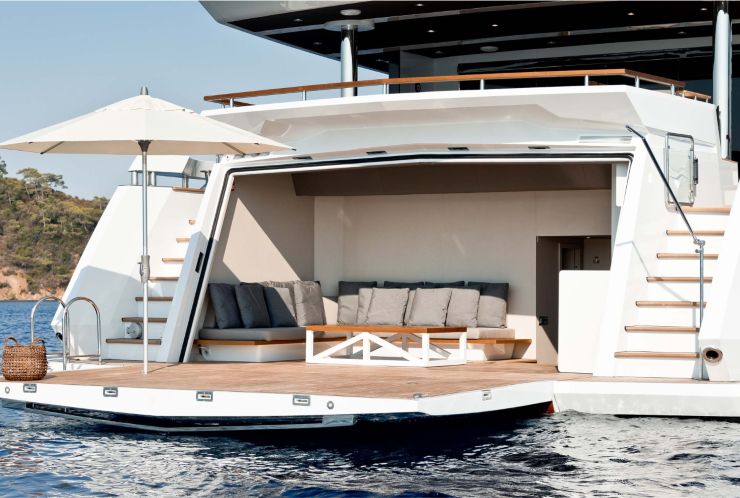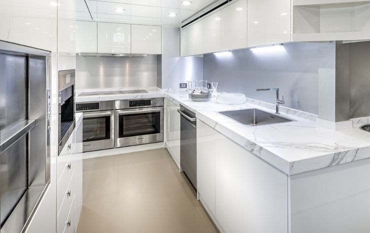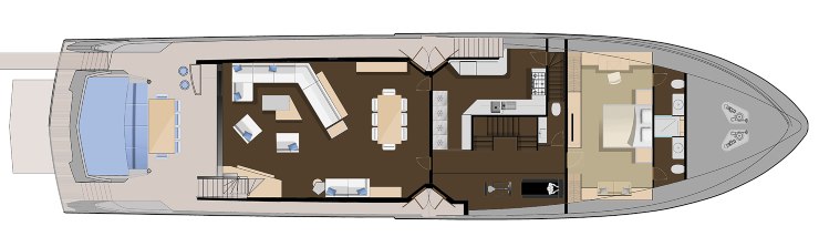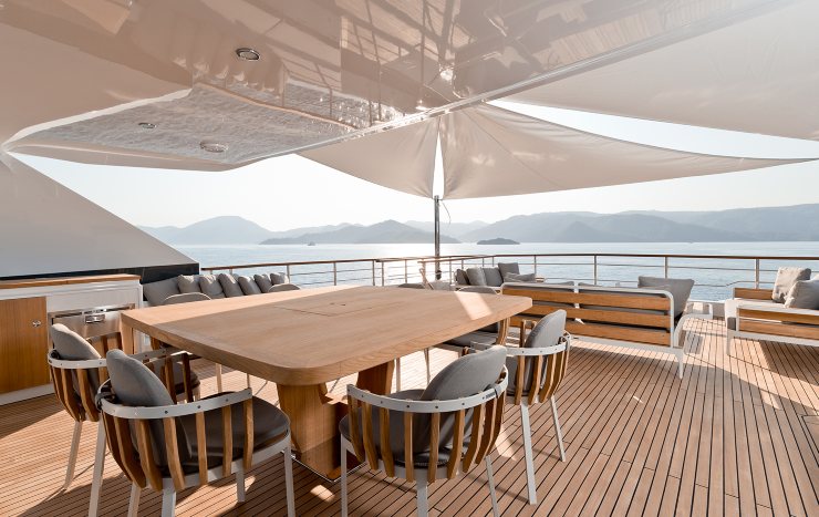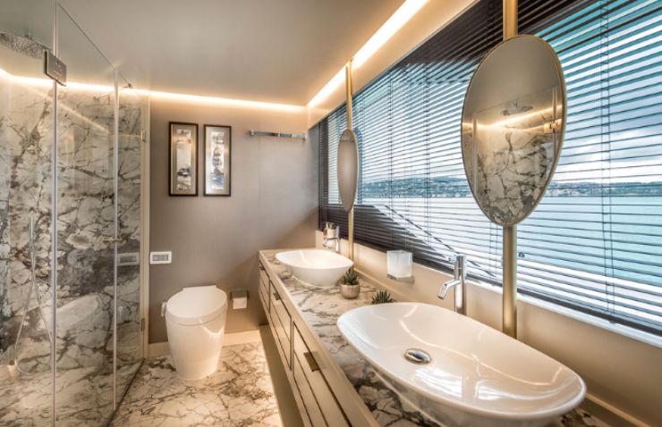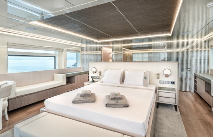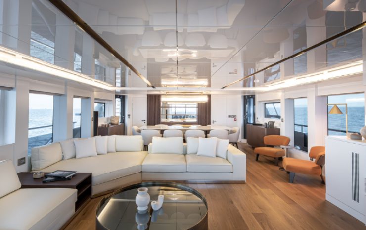 Il ponte principale è pensato come un grande spazio continuo: area relax, zona pranzo e connessione fluida con le aree esterne. La luce naturale, amplificata da finestrature generose, non è solo estetica: riduce affaticamento, migliora vivibilità e rende l’ambiente più “residenziale”. La cucina, a seconda del layout, può essere più “crew-oriented” o più integrata nella socialità di bordo—scelta cruciale per chi vive lo yacht in famiglia.