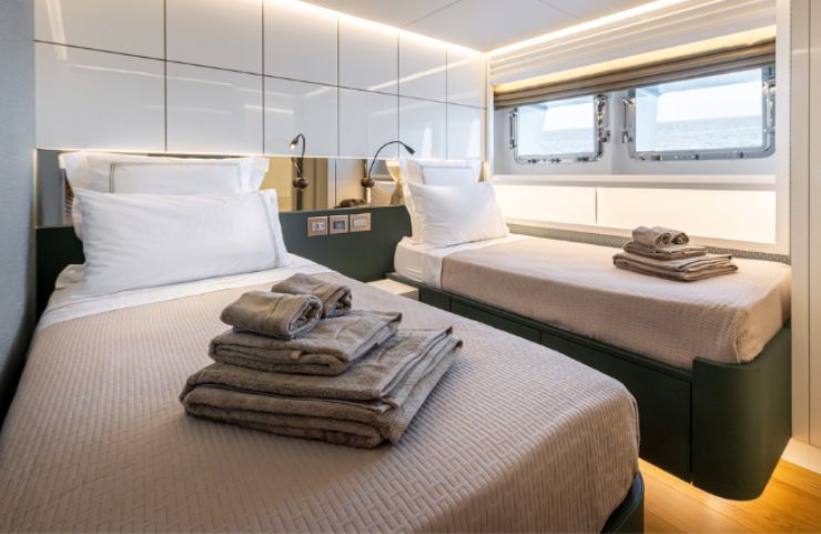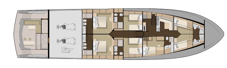 Nel ponte inferiore, le cabine tendono a privilegiare larghezze utili e circolazioni comode, evitando corridoi inutilmente stretti. La differenza tra un 32 metri “tirato” e un 32 metri ben disegnato è proprio qui: nella possibilità di muoversi con naturalezza, nell’avere stivaggi veri, nel non sacrificare i bagni a favore di volumi scenografici ma poco funzionali.