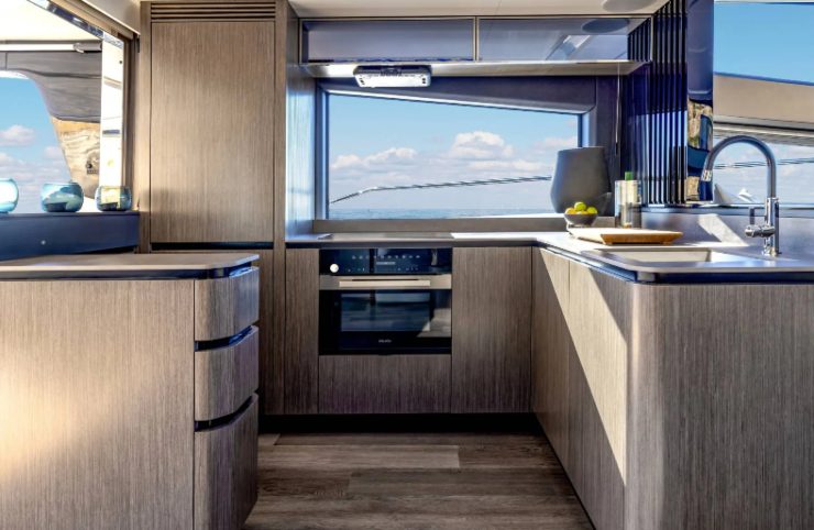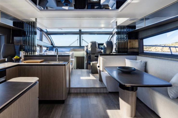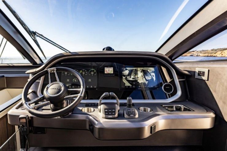 La plancia principale e quella del fly adottano display multi-touch (es. ecosistemi Garmin integrati) per navigazione, gestione motori e controlli di bordo; la logica di interfaccia privilegia pagine contestuali con accesso rapido a trim, waypoint e sensori di sentina. Il sistema di monitoraggio centralizza parametri chiave (temperature, livelli, allarmi) mentre una domotica semplificata governa luci, oscuranti, climatizzazione e media con scene preimpostate. L’insieme dialoga con joystick IPS, thruster proporzionali e Dynamic Positioning per manovre silent-stress, consentendo al proprietario di condurre la barca senza equipaggio professionale, se desidera.