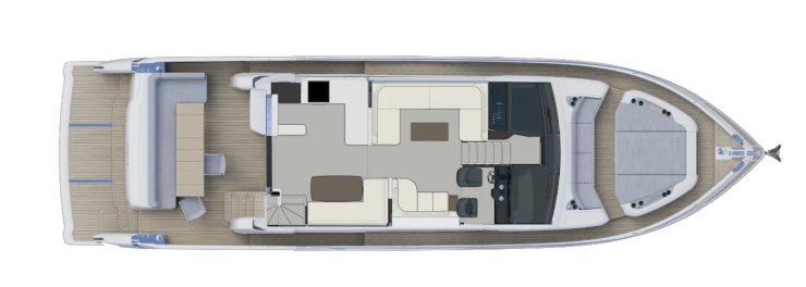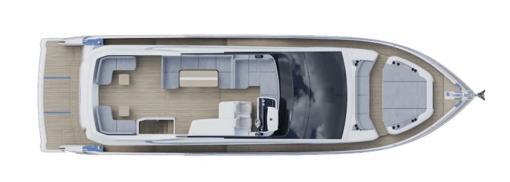 Il flybridge, con hard-top opzionale e pannello apribile, distribuisce peso in alto in modo controllato grazie alla sovrastruttura alleggerita; i corrimani integrati e passavanti protetti concorrono a una fruizione sicura anche con mare formato. La plancia di poppa è dimensionata per gestire varo/alaggio del tender e per fungere da spiaggetta attrezzata. L’assetto statico è studiato per minimizzare il trim negativo con garage carico, aiutando l’uscita in planata e la visibilità dalla postazione di guida.