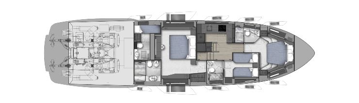 La distribuzione dei volumi sottocoperta, con zona notte centrale/prodiera e engine room a poppa, è studiata per mantenere il baricentro longitudinale nella posizione ideale rispetto al punto di spinta delle eliche di superficie. L’obiettivo è ottenere un assetto naturalmente performante, riducendo la necessità di correzioni tramite flaps e trim e migliorando i consumi alle velocità di crociera elevate.