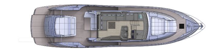 A poppa, il 7X offre un ampio pozzetto organizzato attorno a un divano a C con tavolo da pranzo trasformabile e una grande superficie prendisole sopra il garage. La piattaforma di poppa movimentabile facilita il varo del tender e dei water toys e crea una vera e propria beach area a livello acqua, ideale per la vita in rada. Imbottiture con cuciture a contrasto, inserti in carbonio, acciai lucidati e punti luce LED incassati sottolineano il livello di cura artigianale.
