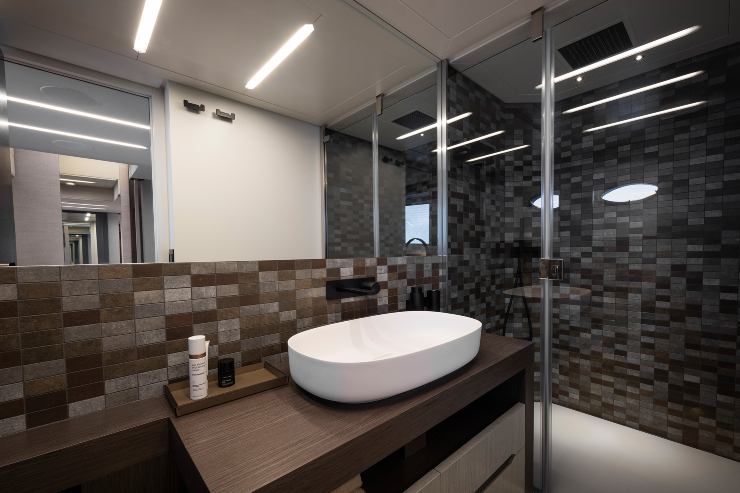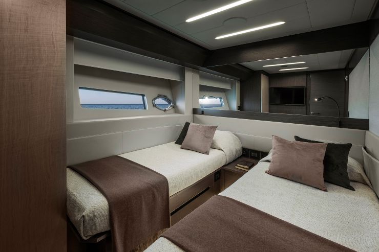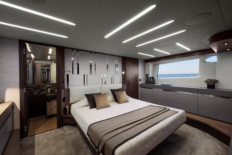 Cabine e arredi — La suite armatoriale full-beam sfrutta il baglio massimo a centro barca; i rivestimenti in pelle e i toni caldi definiscono un ambiente ovattato anche in navigazione sostenuta. Le cabine ospiti mantengono altezze utili adeguate e un’illuminazione naturale filtrata da vetrate lunghe.