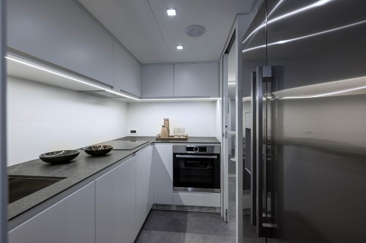Layout e materiali interni — Gli interni sono sviluppati in co-design con Poltrona Frau: plancia e sedute rivestite in pelle, pannellature in carbonio a vista, dettagli metallici satinati. L’ergonomia dei percorsi è studiata per garantire flussi separati equipaggio–ospiti, mentre la zona living principale supera i 40–50 m² a seconda degli allestimenti.