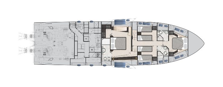 Interni — Quattro cabine (armatoriale full-beam, VIP a prua, due ospiti) ciascuna con servizi dedicati; locale equipaggio separato a prua o a poppa a seconda dell’allestimento. Il salone principale predilige volumi aperti e linee orizzontali, con arredi su misura e inserti in pelle.