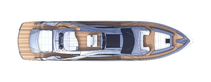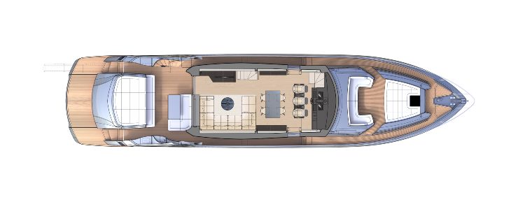Aree sociali — Pozzetto protetto dalle ali laterali, sport-fly superiore con seconda stazione di comando e area prendisole/pranzo, beach area a poppa con garage per tender jet fino a ~3,45 m; soluzioni d’ombreggiatura modulari ampliano l’uso in sosta.