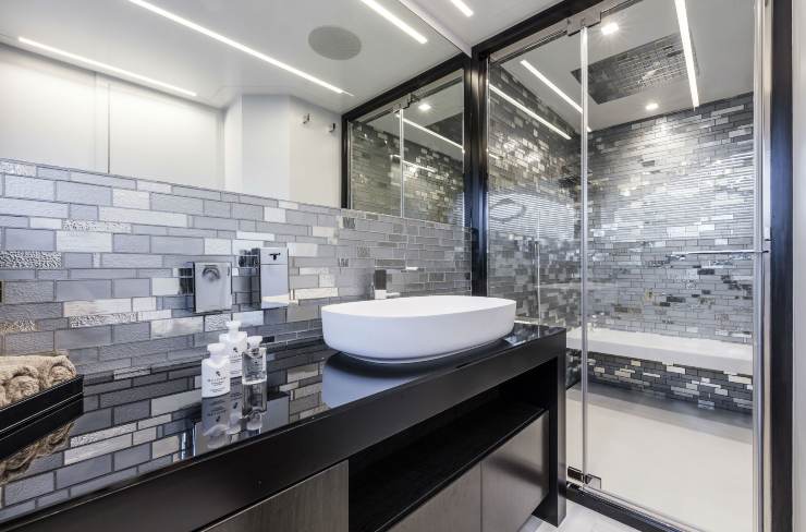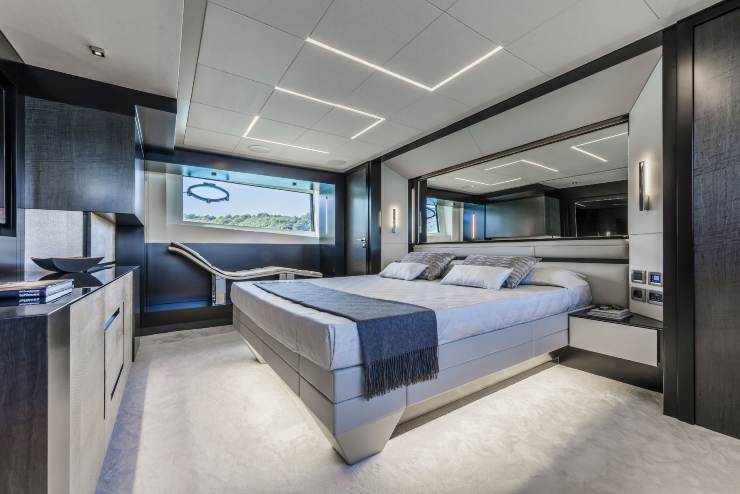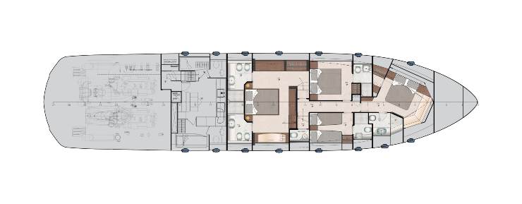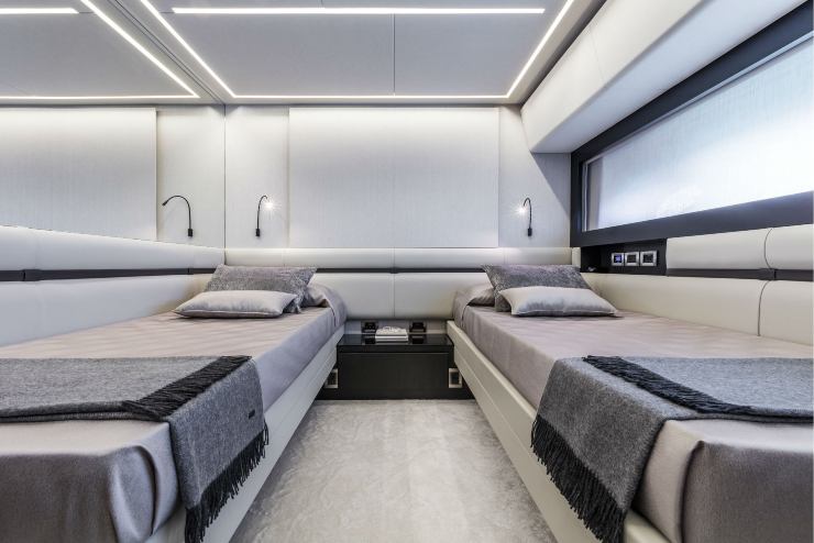 Sottocoperta, l’armatoriale a tutto baglio è il fulcro: luce naturale attraverso ampie aperture nello scafo, bagno en suite con box doccia vetrato, opzioni di vanity o studio privato. La cabina VIP a prua e le due ospiti centrali chiudono un quartetto molto equilibrato, mentre gli spazi equipaggio sono separati per privacy e funzionalità. Materiali e cromie privilegiano essenze naturali, pelli pieno fiore e metalli satinati, sempre con logica di alleggerimento e durabilità in ambiente marino.