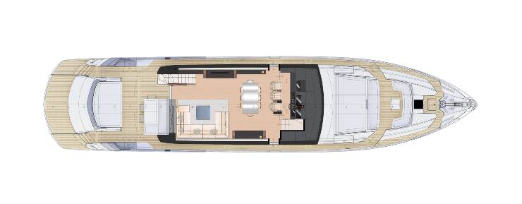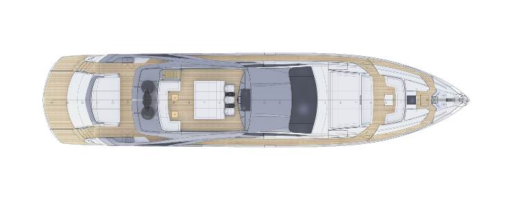 Il tratto estetico è inconfondibile: prua affilata, finestrature a lama, fiancate scolpite e wings che incorniciano la poppa. Il ponte principale è pensato come un continuum tra salone e pozzetto, grazie a vetrate scorrevoli e a un hard-top con aperture che portano luce e aria senza compromettere l’aerodinamica. Il salone ospita living e dining, con layout modulare e arredi su misura; la cucina è dimensionata per servizio vero, non solo di rappresentanza.
