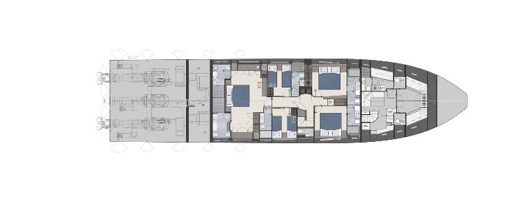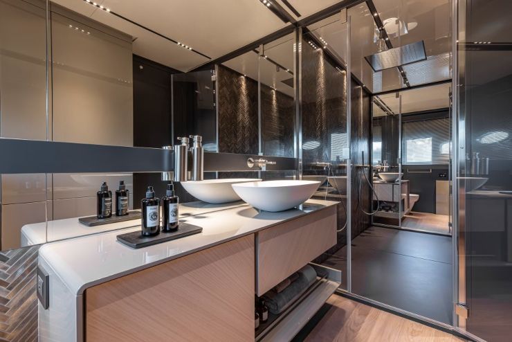 Il corridoio del ponte inferiore beneficia di altezze generose e di aperture a scafo che portano luce diffusa nelle cabine doppie simmetriche. Le due cabine twin, entrambe en suite, consentono flessibilità nell’ospitalità (famiglie con bambini, coppie di amici, charter multiruolo), mentre l’armatoriale introduce una soluzione bagno bipartita con doccia centrale oversize, tipica di yacht di dimensioni superiori. Sistemi di oscuramento elettrico permettono di passare dal panorama alla privacy con un gesto.
