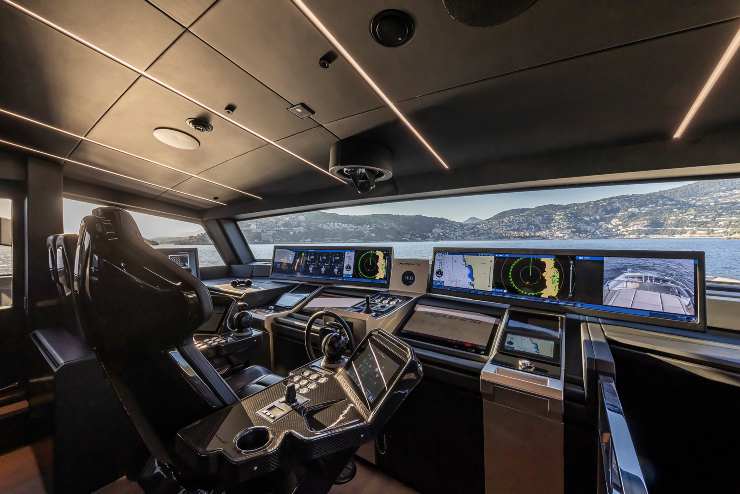 La plancia principale e lo upper helm adottano MFD a scomparsa, joystick per la gestione fine dei tre jet a bassa velocità e un bow thruster dedicato. L’ergonomia è pensata per la conduzione sportiva: comandi doppi per i waterjet, impaginazione human-centered delle interfacce, e un layout pulito che privilegia visibilità e tempi di reazione. A livello di domotica, l’impiantistica integra controllo luci, oscuranti elettrici in cabina armatoriale, climatizzazione multizona e monitoraggio impianti dal bridge.