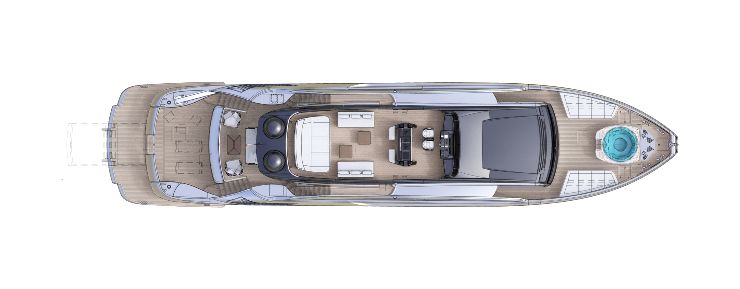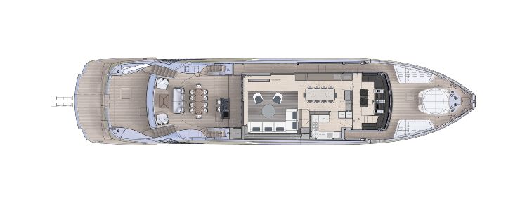 Il beach club è il baricentro sociale: con le ali laterali sollevate e la piattaforma trasformatrice abbassata, la superficie utile raggiunge dimensioni rare per la classe (circa 39–40 m²). Dal club si accede al cockpit superiore, che offre dining, bar e frigoriferi sotto le murate; soprastante, lo sportfly concentra timoneria e prendisole, con set-up minimalista e parabrezza monolitico a massimizzare la visibilità in navigazione sportiva.