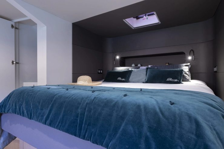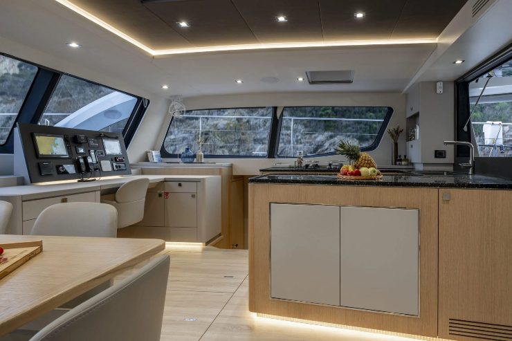 La sensazione è quella di un loft panoramico: luce naturale generosa, superfici continue, differenziazione di zone per privacy e socialità. I materiali sono selezionati per tattilità e durata: tessuti tecnici, legni con finiture resistenti all’ambiente marino, piani di lavoro in materiali compositi robusti e di facile manutenzione. La climatizzazione, combinata con un isolamento accurato, consente di vivere a bordo tutto l’anno, dai Caraibi al Mediterraneo estivo.