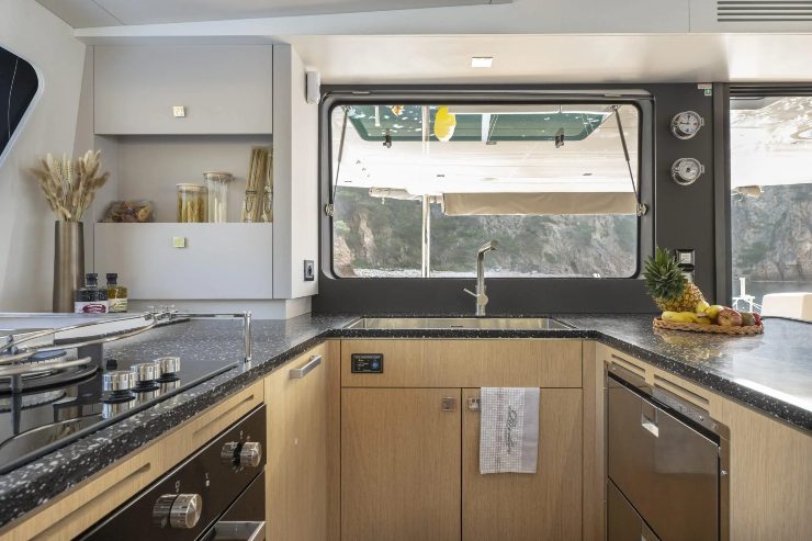 Serbatoi nell’ordine dei 1.000 litri e desalinizzatori di taglia 100–200 l/h coprono esigenze reali di una famiglia o di un charter premium. I circuiti acque nere e grigie sono dimensionati e accessibili, con componentistica di qualità e facilità di ispezione. In cucina, elettrodomestici “residenziali” (forno, piano cottura, frigoriferi a cassetti) sono integrati in un impianto elettrico pensato per carichi continui.