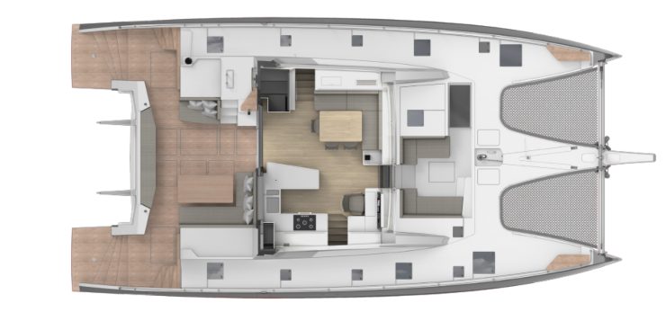 La suite armatoriale sfrutta la connessione diretta con il pozzetto di prua, trasformandolo in un’estensione privata all’aperto. Le versioni a 3, 4 o 5 cabine mantengono bagni indipendenti e volumi di stivaggio adeguati a crociere lunghe. La scelta tra galley up (cucina in salone) e galley down (nei bracci) dipende dall’equilibrio desiderato tra convivialità e spazi living: la prima rende la cucina protagonista, la seconda libera la dinette per una zona lounge di respiro maggiore.