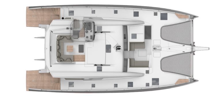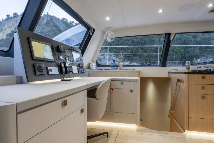 Le aree operative (manovre, timoneria, winch) restano segregate rispetto agli spazi conviviale. Il passaggio salone–pozzetto è quasi a filo, privo di discontinuità, e permette di trasformare la zona giorno in un ambiente aperto quando le condizioni lo consentono. Corrimani, altezze e luce radente serale sono stati considerati nella progettazione per incrementare sicurezza e comfort.