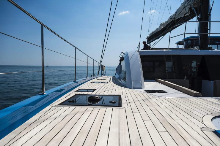 Scafi e coperta sono realizzati in composito sandwich con anima a cellule chiuse e resine di qualità marina. L’infusione assicura rapporto fibra/resina ottimizzato e controllo del peso. Le aree soggette a concentrazione di sforzi presentano rinforzi locali e traverse dimensionate. La tuga, con grandi superfici vetrate, è sostenuta da telai strutturali per limitare flessioni e torsioni. Gli interni combinano essenze pregiate, pannelli alleggeriti e giunzioni pulite: un mix che restituisce un’impressione di robustezza elegante.
