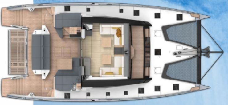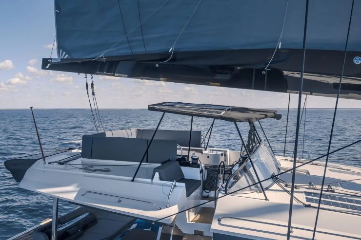 Il flybridge ampliato ospita un grande living a U con tavolo e la timoneria principale a dritta (con opzione di secondo timone a sinistra). Tutta la manovra corrente è rinviata a quattro winch elettrici, con un’impostazione che consente di governare il catamarano anche in due persone, mantenendo sempre una visibilità ottimale sulle vele e sull’ambiente circostante.