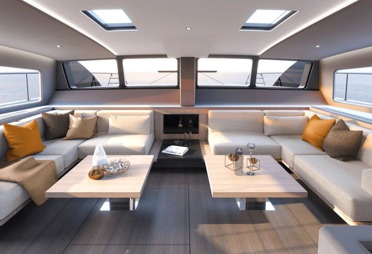 All’interno, il marchio di fabbrica di Franck Darnet è evidente: volumi luminosi, superfici pulite, palette materiche calde e contemporanee. Il salone di circa 21 m² è concepito come hub sociale della barca, con doppi divani, tavoli trasformabili e ampie superfici vetrate che garantiscono una luce naturale quasi domestica.