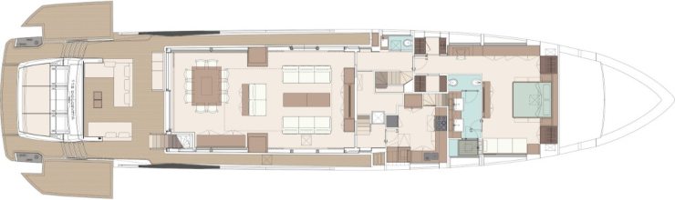 Gli spazi comuni dialogano con l’esterno: dal salone al beach club la continuità di finiture e piani pavimentali rafforza la percezione di un “open loft” sul mare. A prua, la lounge ripara dal vento apparente e consente colazioni o cocktail durante gli spostamenti tra ancoraggi. Sul fly, la zona dining è servita da wet bar e frigoriferi dedicati, con tetto apribile/ombreggiatura modulare a seconda dell’esposizione.
